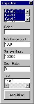 Elle sert à faire des acquisitions analogiques simples ou multiples. Elle permet aussi de régler les différents paramètres pour l'acquisition. Elle est accessible à partir du menu "Action / Acquisition".