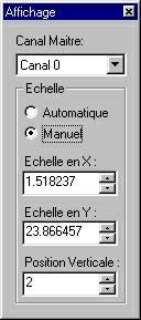 Cette boite de dialogue sert à configurer l'affichage des courbes et surtout de sélectionner le "Canal Maître". Elle est accessible à partir du menu "Affichage / Boite d'affichage".